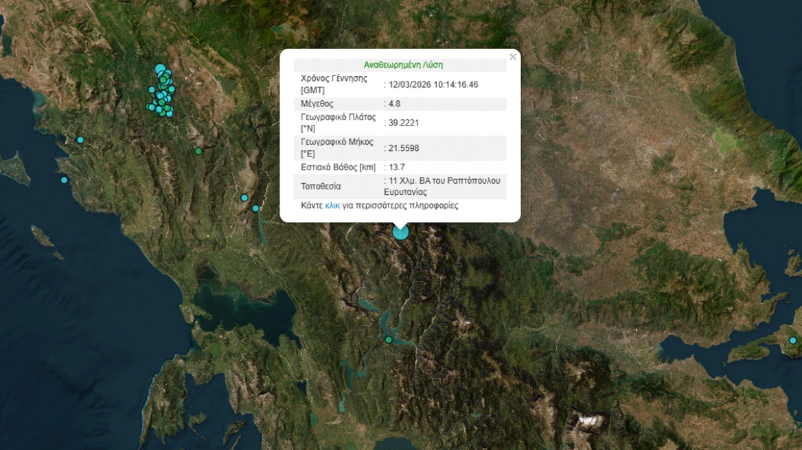 Σεισμός σημειώθηκε λίγο μετά τις 12:18 στην Ευρυτανία και ειδικότερα στο Ραπτόπουλο, κοντά στα Άγραφα με την έντασή του να υπολογίζεται στα 4,8 Ρίχτερ.