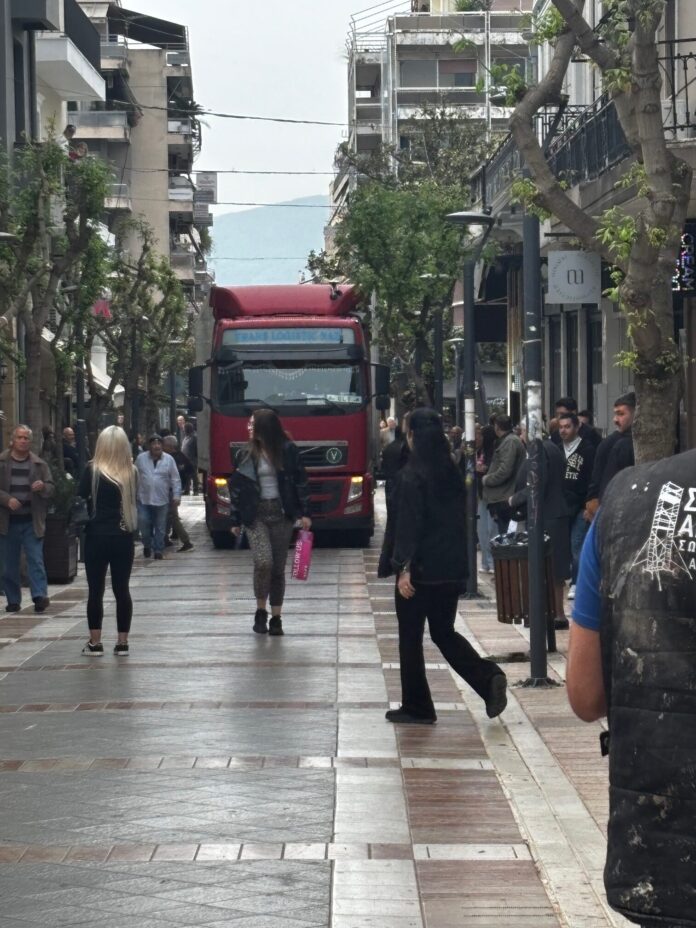 Την ίδια στιγμή οι πολίτες παρακολούθησαν με απορία την νταλίκα να διέρχεται την οδό Παπαστράτου.
